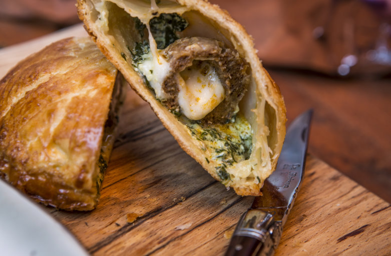 Verdeel het spinaziemengsel over zes van de deegcirkels, laat hierbij een centimeter van de rand vrij. Leg er een gevuld gehaktballetje op. Maak eventueel met een vork een mooi streeppatroon op de resterende deegcirkels en dek hiermee de belegde deegcirkels af. Druk de rand met een vork aan. Klop het resterende ei los en bestrijk hiermee de deegpakketjes.