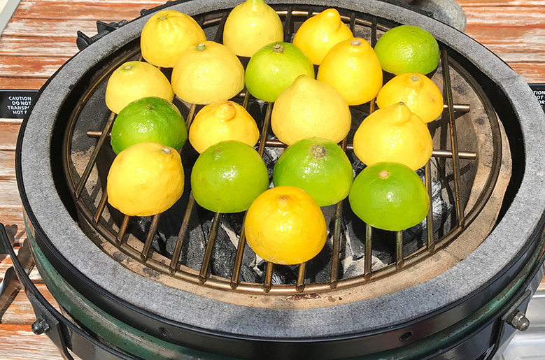 • Steek de houtskool in de barbecue aan en verwarm deze indirect tot 200 °C. Klop intussen de eiwitten met de suiker in een kom met een mixer tot het mooie, stijve pieken vormt. Je moet de kom ondersteboven kunnen houden zonder dat het eiwit eruit valt.
